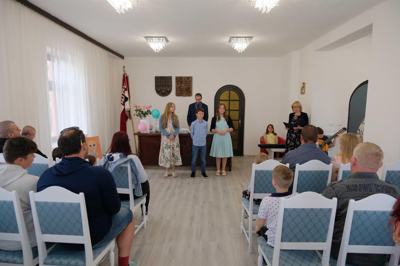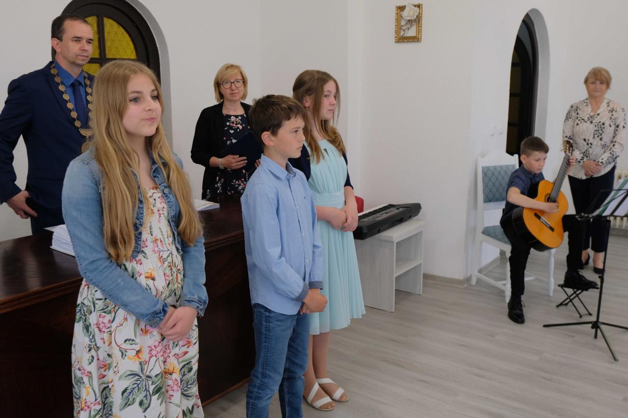 Žáci čtvrté třídy Ema, Kristýna, Natálie, Jára a Michal přivítali 11. 5. 2024 nové občánky Velké Hleďsebe a jejich rodiče, prarodiče.